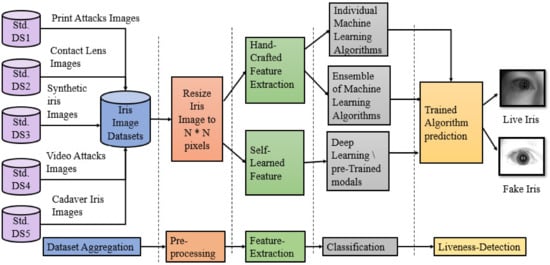 In the machine learning approach of iris liveness detection, the researchers apply hand-crafted image feature extraction algorithms to retrieve image features from iris images. First, handcrafted feature extraction techniques such as LBP, local descriptors, quality analysis, SIFT, BSIF, histogram, and wavelet transform are used for feature extraction. Then the classification methods are used, such as support vector machines (SVM), random forest, MLP, Naive Bayes, random trees, etc., to categorize the images into two classes of live images spoofed images, based on the extracted image features. The preceding methods’ findings indicate that hand-engineered features are suitable for overcoming the PAD issue in “iris recognition systems”. However, their disadvantage is that the design and selection of Handcrafted Feature Extractors are chiefly based on the expert knowledge of the researchers on the” problem.