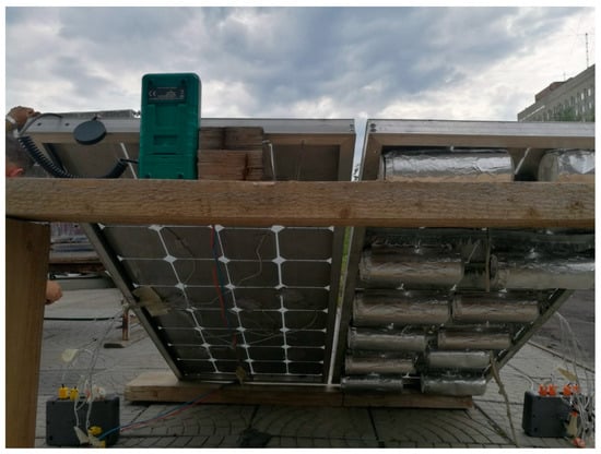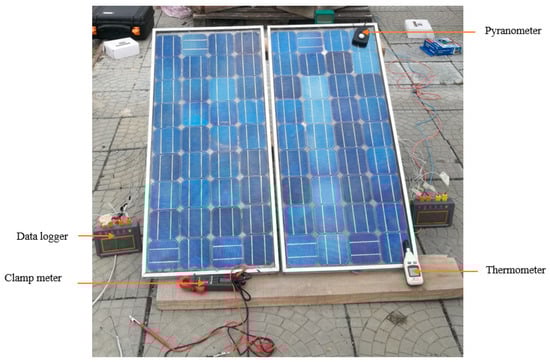 In conducting the experiment, both panels were positioned 45° to the south to obtain maximum solar radiation. Figure 2 shows the rear side of the two panels (i.e., referenced, and cooled PV modules). Figure 3 is the schematic diagram of the experimental set-up. The temperature of the two panels were recorded using seven thermocouples manufactured by Weewooday and supplied by Amazon, for each module. The thermocouples were attached at different positions to allow us to find the mean temperature distribution of the PV module at each reading. The current and voltage were measured with a clamp meter (RS Components Ltd, China). The wind speed with anemometer, the intensity of the solar radiation was also measured using pyranometer supplied by Amazon, while the ambient temperature and humidity was measured using the GM 1362-EN-01 thermometer manufactured by Shenzhen Jumaoyuan Science And Technology Co., Ltd., Shenzhen, China.