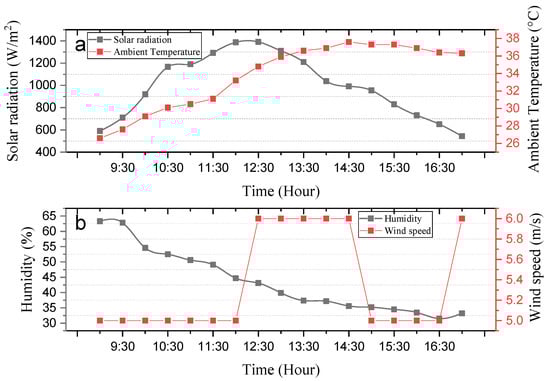 (a) Solar radiation and ambient temperature (b) humidity and wind speed characteristics for the experimental day.