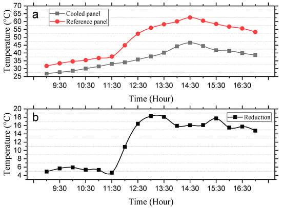 The average temperature reduction () can be calculated by summing the various temperature change amid the cooled panel and the referenced panel as presented in Ref [] as indicated in Equation (9).