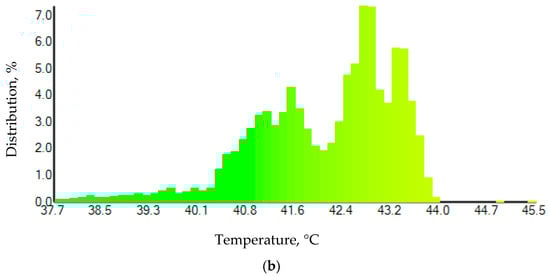 The testo infrared camera (manufactured by Testo in Germany) was also used to record the temperature profile for the two panels. This helps to pictorially see the effect of the cooling mechanism on the temperature distribution of the panel. The reading was taken at exactly 12.00 pm mid-day at which time the paraffin wax had fully melted, and the solar radiation intensity was high. The minimum temperature for the cooled panel was 34.9 °C and a maximum temperature of 43.9 °C, it however, recorded an average temperature of 37.5 °C. In the case of the referenced panel, a minimum temperature of 38.1 °C and a maximum temperature of 43.9 °C were recorded, it also recorded an average temperature of 42.1 °C. Note that these values are only for the specific time mentioned supra and not for the entire experimental period. These values vary slightly from that recorded using the thermocouples supra because of the fact that the thermocouples have direct contact with the panel and so can give a more accurate result. During that same period, the thermocouples recorded average temperatures of 34.04 °C and 44.9 °C for the cooled and referenced panels, respectively. The histogram for the temperature distribution of the two panels relative to their percentages are presented in Figure 7. The percentage of the various temperatures on the surface of the panel are presented on the y-axis. The thermal image of the two panels is also presented in Figure 8.