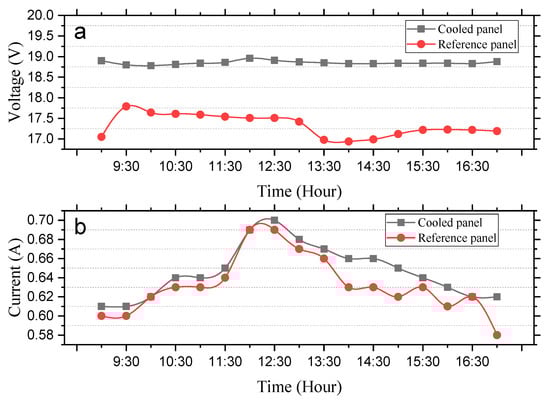 (a) Voltage, (b) current for the cooled and referenced panel.