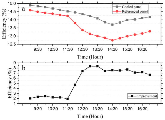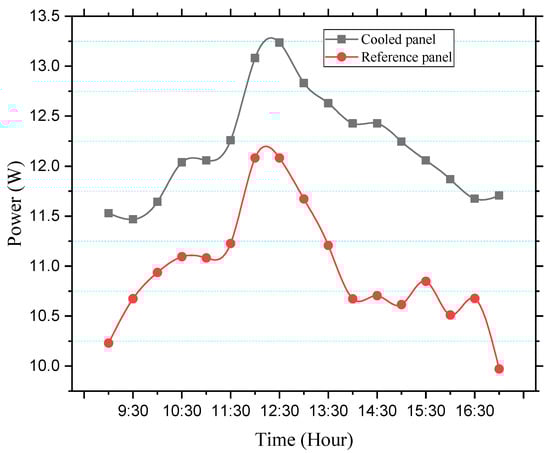 The power output for both panels is represented in Figure 10. The output power of the cooled panel was identified to be highest during the entire period of the experiment. The power of both modules increased with increasing solar radiation along the day. Both modules recorded their highest solar radiation after mid-day, precisely at 12:30 pm when the highest solar radiation was recorded. The power however started to decrease after mid-day when the temperature of the cell increased, and the intensity of the solar radiation reduced. The average power for the cooled panel is 12.19 W against 10.95 W for the referenced module. This is 1.24 W difference between both panels, which is 11.33% improvement in the power output due to the temperature reduction of the cooled panel occasioned by the proposed cooling mechanism. In the study of Luo et al. [] who employed the traditional way of applying paraffin PCM for temperature management of a PV module, they obtained a maximum power of 18.30 W for the PV-PCM panel against 17.85 W for the conventional or referenced module. There is only 0.45 W difference between the two modules.