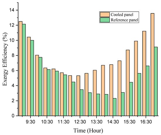Exergy assessment is a thermodynamic analysis of processes and systems which combines the first and second thermodynamic laws to find a system’s available energy values and the amount of energy loss []. The exergy efficiency for the two PV panels were calculated using data provided by supra and Equation (14). The variations of the exergy efficiency for the two modules are presented in Figure 12. As can be seen from the results, increasing ambient temperature and cell temperature leads to a reduction in the exergy efficiency. The exergy efficiency of the PV modules are however higher when the solar irradiation is lowest. This can be seen from the results presented in Figure 12, the exergy efficiency reduced from the start of the experiment up until mid-day for the cooled panel, it however, started increasing again when the solar radiation started reducing. However, the exergy efficiency of the referenced PV module saw a reduction up until 3:00 pm before it started to increase again. This can be attributed to the fact that the temperature of the referenced module was relatively hotter especially after mid-day when the cell temperature of the module was very high. This is because the rate of increase for input exergy is relatively more than the rate of increase of the output exergy with increasing solar irradiation at constant ambient temperature. The cooled solar PV module recorded an average exergy efficiency of 7.99% against 5.61% for the referenced module.