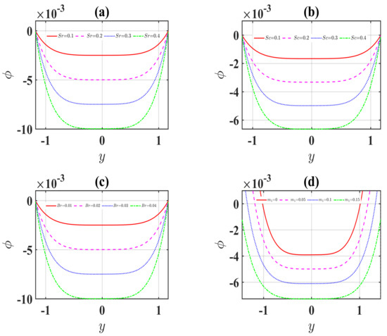 - The concentration profiles significantly diminish for more significant values of the Schmidt and Soret numbers.
