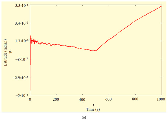 When moving along the trajectory, the UV crossed points with exactly known coordinates λ and φ (traffic lights—radio beacons) at 150, 158, 250, and 255 s. Up to 158 s, the error δH in determining the measurement matrix was set as an additive matrix , from the 200th to the 255th s, respectively, as . According to the proposed approach, the exact values of λ and φ at the 158th and 255th s were used to determine the values of the components of the δH matrices, which were then used to correct the measurement matrix in the filter (12).