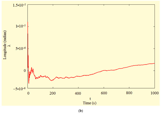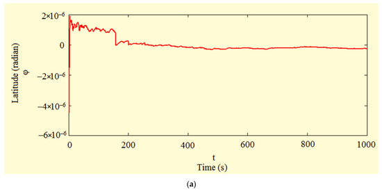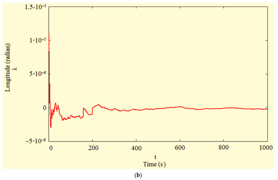 Graphs of latitude φ (a) and longitude λ (b) estimation errors obtained when implementing the adaptive filter.