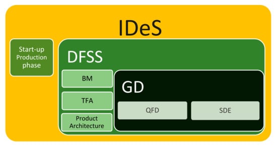 Moreover, this document aims to explain the application of the IDeS methodology for product development. IDeS is a design-based method to gather the appropriate organization structure needed to seamlessly develop a product designed accurately for a specific market segment, and that needs to be put into production in a short time. Therefore, IDeS methodology would organize the design steps of industrial projects, allowing to generate a link between the design structure and the company organization. With this process, IDeS methodology proves to deliver a customer-centered product by taking into account the industrialization part, which is of great importance in order to throw a high quality product that would be economically feasible to the organization. Figure 1 summarizes the IDeS methodology as a procedure which involves both product development and start-up phases, leading to adopt a different company organization. This method is an evolution from past, well-known design methodologies like QFD and SDE, which englobe the GD approach, and DFSS that has been accepted by industries worldwide for reaching high quality levels, by using tools like the Top–Flop Analysis (TFA), Benchmarking (BM) and Product Architecture deployment. Different research findings about the application of this methodologies demonstrated the objective to gather a full project concept approach to provide the designer with a scheme that could guide them through the work for best results across all departments [,,,]. However, it can be used across many industries such as automotive, electronics, information technology, marketing, waste management and medical plants.