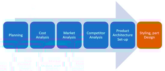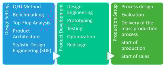 Subsequently, previous research has been performed with the intention of expanding previously known design methodologies, like SDE [] and QFD, towards IDeS methodology by means of including additional production-wise approaches. Trials have been made about conceiving a futuristic family car [], a city car [] and a futuristic mobility solution [], solutions of which started to build up the design approach together with the feedback of other project development areas including production. The proposed product set-up phases can be seen in Figure 2. Later, a description of GD was made by Briard, Segonds and Zamariola [] as a set of know-hows which would indicate the main design parameters, or to optimize an existing design, in order to take on previous defined criteria by the end user. This approach to a design decision rules out that a complete analysis must be taken prior to beginning to analyze the different design options of the part. The research of Marinov et al. [] states that the GD approach is keen to synthetize design choices by analyzing the whole part in order to reach objectives. This approach could also be useful to gather every relevant input of the part, like simulation parameters, comparison criteria and final market scope decisions.