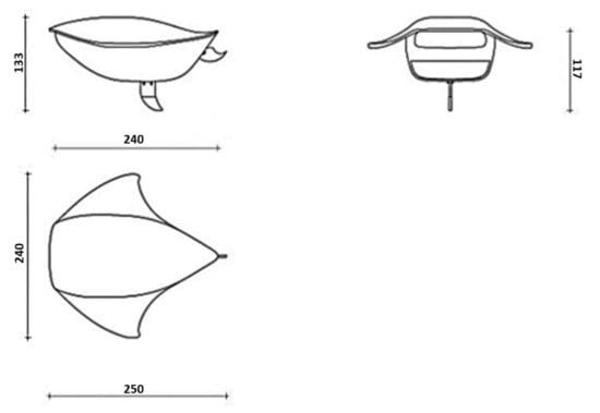 One of the first design constraints to emerge through the project was the material choice for the construction of the prototype, as technical characteristics such as adaptability to the sector of use, resistance, unsinkability, and economic and environmental sustainability were considered. Figure 14 represents the orthogonal projections of the drone to be made. In particular, all the dimensions chosen for its prototyping are highlighted.