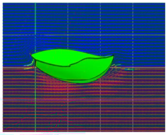 Subsequently, CFD multiphase (two-fluid) simulations (Figure 20) were performed on the obtained structure in order to check for possible flow turbulences that would compromise the stability at the sea, and to check that water would theoretically not enter into the waste storage area. This resulted in a maximum turbulence of about 25% in such. Fluid flow simulations show a mostly laminar behavior that would guarantee a sleek displacement of the unit in the water.