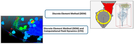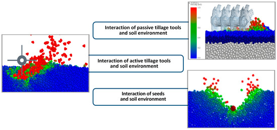 To study the processes of interaction of soil with seeds and working organs, the method of discrete elements is also increasingly used (Figure 6). The following groups of studies can be distinguished. The most significant group is the study of the interaction of passive working organs with the soil environment [37]. Quite a lot of works devoted to the study of the interaction of active working organs with the soil [38,39]. There are also separate studies modeling the interaction of seeds and soil [40,41], fertilizer granules and soil [42].