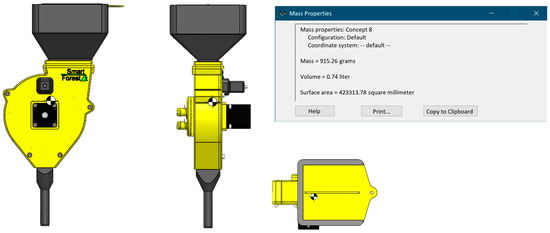 The patent for the investigated sowing device was obtained on 11 November 2019 (concept 8), application number PI2020005912. The name of the invention is “Seeder for UAV”. In the process of writing this work, a patent application for the sowing device of concept 7 was also formed and filed.