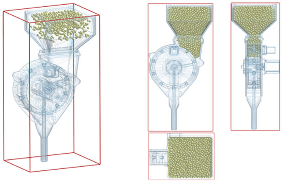 For simulation studies of sowing devices at the moment, the most commonly used numerical method is the discrete element method (DEM) (Figure 5). It allows to effectively simulate the processes of interaction of the elements sowing device with an almost unlimited number of seeds of various shapes. In this case, the laws of interaction of seeds with each other and with the elements of the sowing device, as well as the strength parameters of seeds and their covers, can be taken into account. To do this, they are represented as a collection of related discrete elements. Let us briefly consider the existing studies of various sowing device carried out by DEM methods.
