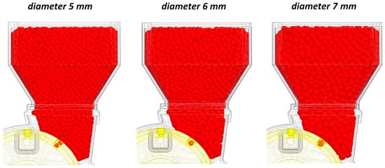 The discrete element method (DEM) was used to carry out simulation studies of the working process of the selected sowing device. The results of modeling the process of filling the hopper showed that with a particle diameter of 5 mm, the total capacity of the hopper and the throat of the sowing device was at least 7426 pcs. With an increase in diameter to 6 and 7 mm, the capacity was 4210 and 2551 seeds, respectively. The total seed mass of the fully loaded hopper was 920.8, 905.2, 870.4 g.