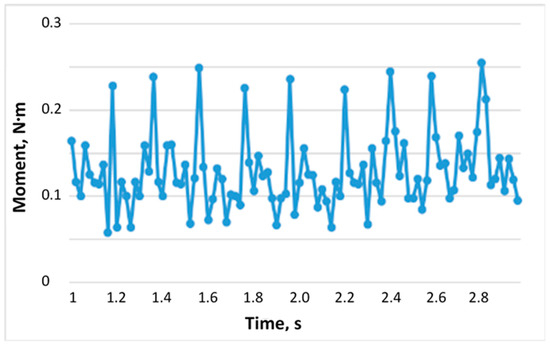 The average value of the torque during one working cycle was also investigated. It is 0.129 Nm. These values were obtained for a drum rotation speed of 180 deg/s used during a UAV flight at a speed of 5 m/s and providing a sowing step of 1 m.