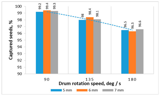 The results of simulating the working process of the sowing device showed that a change in the rotation speed slightly reduced the stability of the capture of seeds. With a double increase in the rotation rate from 90 to 180 deg/s, the average number of missing seeds increased from 0.7 to 3.5%. This is due to the deterioration in the capture and extraction of seeds due to the fact that the experiment did not reproduce the influence of vacuum and excess pressure. In further studies, it is planned to carry out joint DEM-CFD modeling, which will most fully reproduce the operation of the sowing device. Changing the seed diameter did not significantly affect the number of skips.