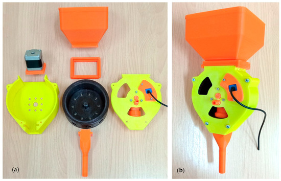Experimental sowing device: (a) Partially disassembled; (b) Fully assembled.