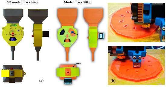 To confirm the mass characteristics and carry out experimental studies, a full-size experimental sample of the sowing device of concept 7 was made. All the main elements were manufactured using extruder 3D printing (Figure 22).
