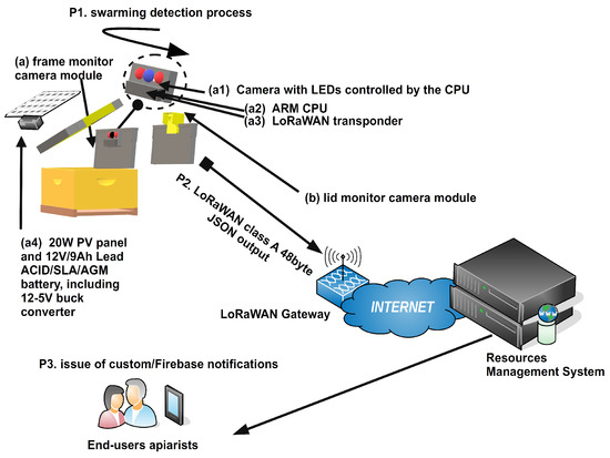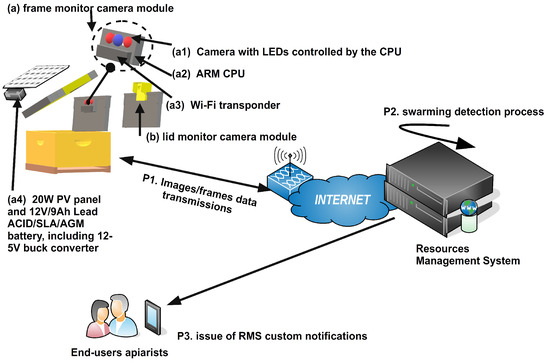 The BeeQ RMS system is a SaaS cloud service capable of interacting with the end nodes via the concentrator and the end-users. For Version 1 devices, the end nodes periodically deliver images to the BeeQ RMS using HTTP put requests (Figure 1 P1). Then, the uploaded photos are processed at the RMS end using the motion detection and CNN algorithm and web interface (see Figure A5) of the BeeQ RMS swarming service (Figure 1 P2).