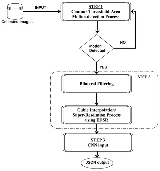 - Step 2—Image transformation and data annotation: The number of collected images per class used for training was annotated by hand using the LabelImg tool [48]. Other commonly used annotation tools are Labelbox [49], ImgAnnotation [50], and Computer Vision Annotation Tool [51], all of which provide an XML annotated output.Image clearness and resolution are equally important in the case of initially having different image dimensions. Regarding photo clearness, the method used is as follows. A bilateral filter smooths all images using a degree of smoothing sigma = 0.5–0.8 and a small 7 × 7 kernel. Afterward, all photos must be scaled to particular and fixed dimensions to be inserted into the training network. Scaling is performed either using a cubic interpolation process, or a super-resolution EDSR process [52]. The preparation of the images is based on the dimensions required as the input by the selected training algorithm, which matches with the underlying extent of the initial CNN layer. The image transformation processes were implemented using OpenCV [53] and were also part of the 2nd stage of the detection process (detection service) before their input into the CNN engine (see Figure 3);