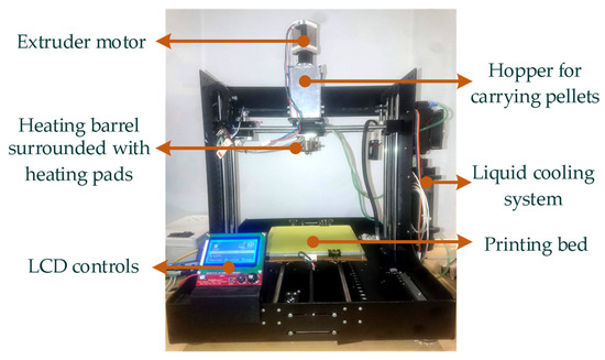 The 3D printing was performed on an in-house built pellet 3D printer [23]. The pellet printer was selected to avoid the thermal variations that are expected to appear in the raw blends due to the thermal shearing process of filament making [12,24]. Furthermore, the pellet 3D printer has a liquid cooling system that maintains the thermochemical properties of the raw blend proficiently until 3D printing as compared to that of filament 3D printer [23].