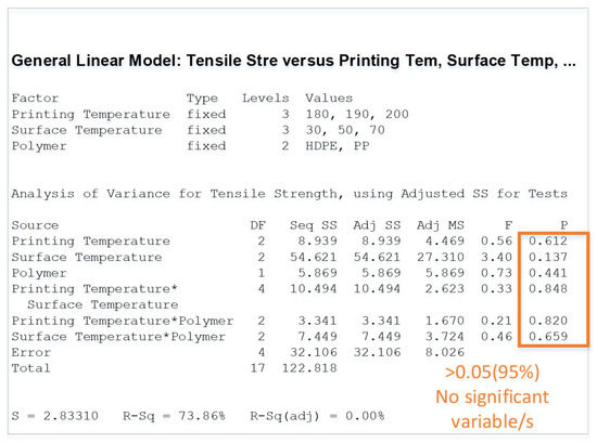 The results of ANOVA analysis for tensile strength are provided in Figure 3 and Table 4. The analysis shows that all variables are insignificant. The insignificance of all variables shows that all three variables (build surface temperature, printing temperature, and polymer additives) have similar values of tensile strength as presented in Table 4. The highest tensile strength for ABS:HDPE:PE-g-MAH and ABS:PP:PE-g-MAH are 30.89 MPa and 30.3 MPa, respectively. The highest tensile strength for ABS:HDPE:PE-g-MAH is noted at combination of 190 °C and 70 °C. On the other hand, the highest tensile strength for ABS:PP:PE-g-MAH is obtained at combination of 190 °C and 50 °C.