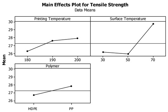 In this regard, the individual effects of each variable on tensile strength reveals true behaviour as noted in “main effects plot” (Figure 4). The “main effects plot” shows the increase of tensile strength with increase of printing temperature, i.e., from ≈26 MPa to ≈28 MPa. Similarly, the increase in surface (bed) temperature results in increase of tensile strength, i.e., from ≈26 MPa to ≈30 MPa (Figure 4). Moreover, the two polymer additives (HDPE and PP) also report increase for PP based ABS blend (≈28 MPa) as compared to HDPE based ABS blends (≈26.5 MPa). This shows that the impact of PP is more as compared to HDPE on ABS blends.