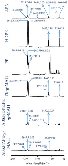 The analysis of ABS blend with HDPE shows visible variations as shown in Figure 6. The overall spectrum of ABS:HDPE:PE-g-MAH is similar to neat ABS. However, the differences are in form of shifts in wavelengths and decrease or increase of intensities. For example, C-H bond of hydrocarbons shifts from 2919 cm−1 to 2917.3 cm−1 and 2847 cm−1 to 2848 cm−1. Acrylonitrile shifts from 2238 cm−1 to 2239 cm−1. Styrene shifts from 1494 cm−1 to 1493 cm−1. Apart from minor changes, couple of major changes includes the absence of nonsaturated hydrocarbon bond and butadiene peak [34,35] in ABS blend. The shifts in wavelengths and absence of peak shows evidence of intermolecular interactions in ABS:HDPE:PE-g-MAH blend.