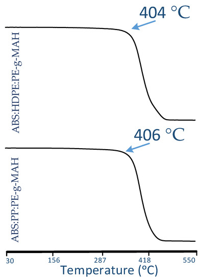 The TGA thermographs are provided in Figure 7. The TGA analysis shows the differences in the temperatures for onset of degradation in both blends. The onset temperature for ABS:PP:PE-g-MAH is comparatively high for to ABS:PP:PE-g-MAH, i.e., ≈406 °C as compared to 404 °C of ABS:HDPE:PE-g-MAH. The difference is minor that validates the similar FTIR graphs for both blends. Similarly, the minor differences in intensities are also justified in form of minor difference of onset temperatures but with ABS:PP:PE-g-MAH with higher numbers. This proves the reason for comparatively high tensile strength of ABS:PP:PE-g-MAH as compared to that of ABS:HDPE:PE-g-MAH.