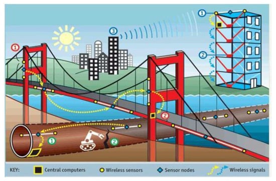 - Zhou, G.; Yi, T. Recent Developments on Wireless Sensor Networks Technology for Bridge Health Monitoring. Math. Probl. Eng. 2013, 2013, 1–33. [Google Scholar] [CrossRef]