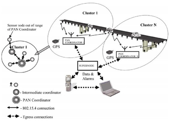 - Whelan, M.; Gangone, M.; Janoyan, K. Highway bridge assessment using an adaptive real-time wireless sensor network. IEEE Sensors J. 2009, 9, 1405–1413. [Google Scholar] [CrossRef]