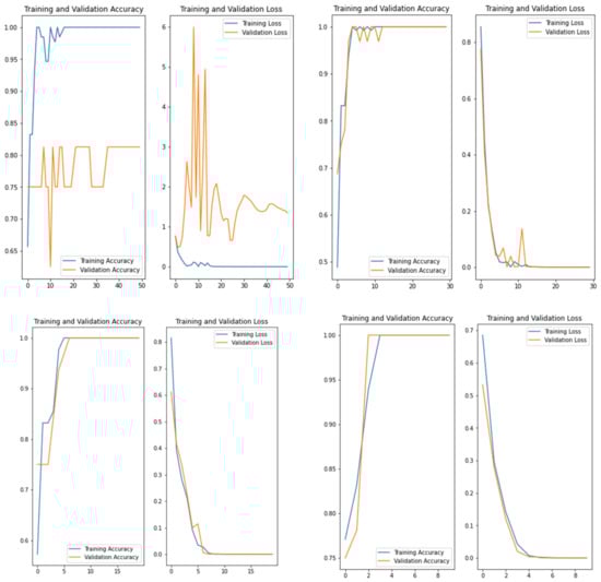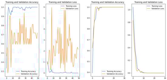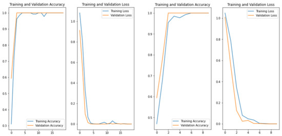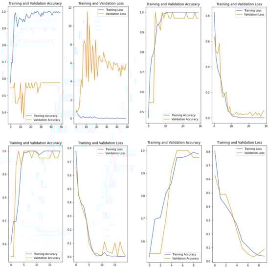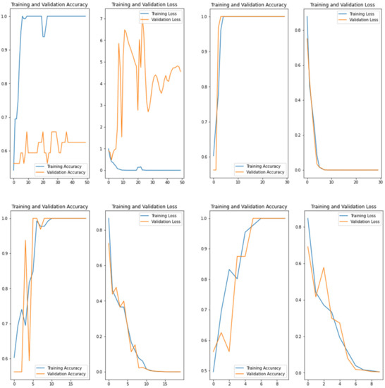 As shown in Figure 4, Figure 5, Figure 6 and Figure 7, during the training of the CNN, the accuracy of the training set (blue line) continued to increase and the network was learning constantly. The validation set (orange line) first increased, then overfitting occurred and the accuracy showed an unstable variation. The same behavior was observed for loss curves. Consequently, we investigated the number of epochs and selected the best number to solve the overfitting problem.