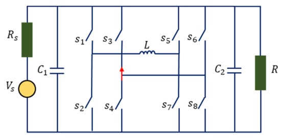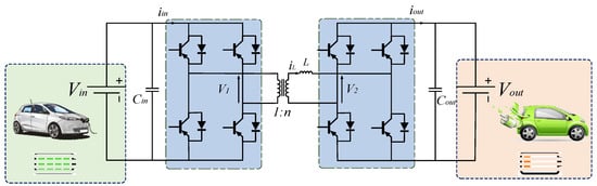 As depicted in Figure 2, the voltages which are generated by the two bridges are represented as and , respectively. In addition, is the input current, is the current of the coupling inductor, and is the output current. To control power flow, the time delay between and is , where is the duty cycle and is the switching period.