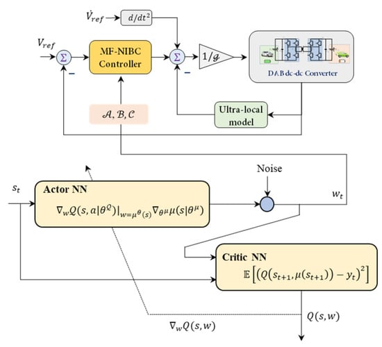 Some parameters are embedded in the structure of the MF-NIBC controller which should be appropriately adjusted to regulate the output of the DAB dc-dc converter. The terms of , and are the key parameters in the law control of MF-NIB (Equation (30)) which will be adjusted by the DDPG algorithm. The overall structure of the proposed DDPG based MF-NIB controller is depicted in Figure 5.