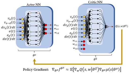 where and are the reward penalty, and is the defined deviation of the output voltage from the nominal value. Utilizing the capability of the neural networks, the DDPG agent tunes the control parameters in such a way that stabilizes the output voltage by maximizing a reward signal. The structure of deep neural networks of DDPG algorithm has been depicted in Figure 6.