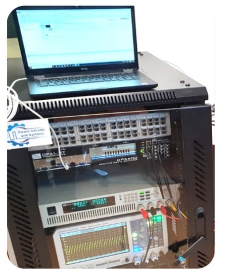 To validate the effectiveness of the proposed controller and the performance of the smart charger, the real-time results are discussed in this section. The setup tests based on the OPAL-RT are represented in Figure 7. The electrical parameters of the suggested EV smart charger are listed in Table 1, and the controller parameters are listed in Table 2. In order to investigate the applicability of the proposed Emergency EV-to-EV battery charger (EPBC), several conditions can be assumed based on the electrical specification of the EV’s battery. For this purpose, three scenarios can be studied based on the voltage of the battery.