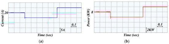 Real-time results for the power changes in the emergency charging mode in the proposed EPBC: (a) output current, (b) output power.