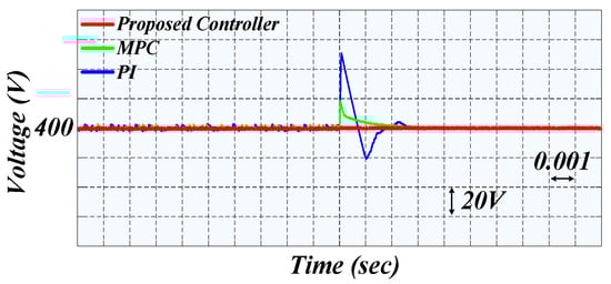Comparison of the voltage transient responses of the proposed MF-NIBC controller, MPC, and the conventional PI controller during a step change in the output power in the first scenario.