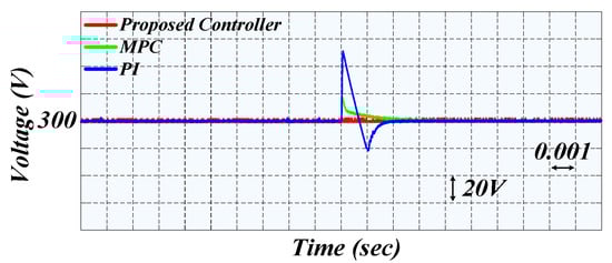 Figure 8a,b shows the step change of the output current and output power of the proposed EPBC, respectively. The output voltage of the proposed charger is shown in Figure 9. In order to demonstrate the performance of our proposed charger with the novel suggested MF-NIBC controller, a comparison with the MPC controller and the conventional PI controller is carried out. From Figure 9, it can be observed that the proposed controller has a better transient response and can guarantee the stability of the output voltage of the DAB dc-dc converter. Moreover, controlling the output current can be realized at the same time.