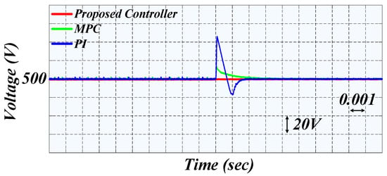 Comparison of the voltage transient responses of the proposed MF-NIBC controller, MPC, and the conventional PI controller during a step change in the output power in the second scenario.
