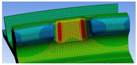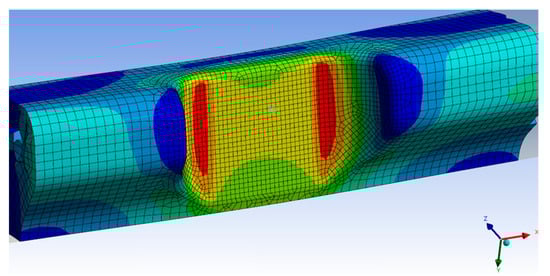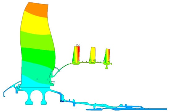 At the first stage, we analyzed the axisymmetric model, including the preparation of the parametric model, setting the boundary conditions, transferring the temperature field from the aerodynamic calculation and simplifying the non-axisymmetric elements to unit masses []. The axisymmetric calculation makes it possible to obtain a fairly accurate picture of the distribution of displacements (Figure 1) and obtain the boundary conditions for further three-dimensional calculations.