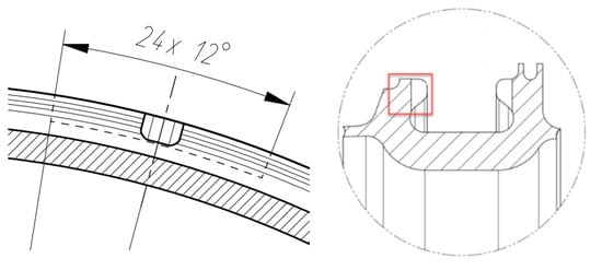 The next stage is to conduct a series of calculations of a three-dimensional sub-model of the rotor sector containing the critical area. A parametric model is also developed for this stage []. The calculation takes into account the boundary conditions from the previous axisymmetric calculation, contact interaction of blades and drum, temperatures and centrifugal loads. Stress deviations in the critical zone can be up to 4%, depending on the chosen three-dimensional sector []. The Figure 2 shows the distribution of surface stresses in the booster drum sector. This calculation was used for engine certification.