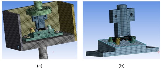 To increase the reliability of modeling, two models of the coupled parametric model of SSE and the test rig were prepared. Calculations of the complete test rig assembly and the simplified model were performed. The finite element grid is shown in the Figure 7a for the full model and in the Figure 7b for the simplified model. The deviations of stress and SSE displacements during the transition from the full model to the simplified model are insignificant, so further calculations were performed for the simplified model; the characteristics of its finite-element mesh are given in the Table 1.