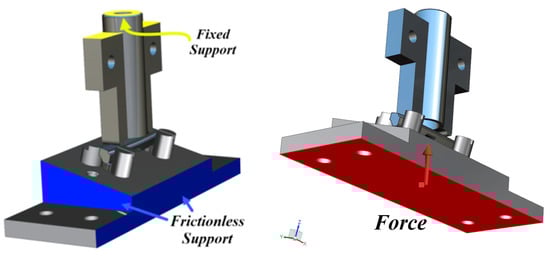 The boundary conditions for the calculation of the coupled parametric model are shown in the Figure 8. The upper part of the pusher is fixed, a force from the machine drive is applied to the lower part of the retainer and a constraint of displacements along the axes perpendicular to these surfaces is added to compensate for the lack of structural rigidity from the discarded parts on the plane of the retainer, highlighted in blue.
