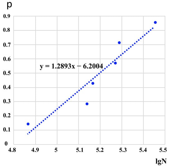 The graph of the distribution function of the logarithm of life shows (Figure 13) that a linear distribution can be assumed with a high degree of confidence. Then, the probability values p were converted into quantiles of the normal distribution using the inverse function of the standard distribution NORMSINV in EXCEL.