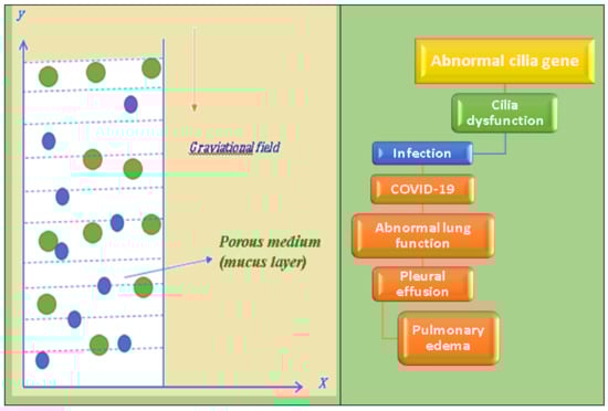 Mukhopadhyay et al. [] investigated a mathematical mass transfer model of blood flow under stenotic scenarios. The Carreau fluid model classifies circulating blood as a non-Newtonian fluid, with the vessel wall being thought of as flexible. A non-Newtonian biofluid’s pulsatile hydromagnetic flow and heat transmission through a saturated non-Darcian poroelastic channel with viscous heating were investigated by Rawat et al. []. Mucus excretion inside the airways is a physiological way to safeguard the lungs by absorbing and expelling inhaled persistent materials via the mucociliary elevator []. Globally, infectious diseases are a significant cause of morbidity and mortality. Malaria, TB, and viral hepatitis contamination are exceptionally hard to treat, as they are constantly propagating and have low survival percentages []. Mucosal tissue is generated by goblet cells in the membrane of mucosal surfaces of the lungs. Microbes congregate on a surface and create an extracellular matrix of large polysaccharides (such as glycerin and N-acetyl glycine), DNA, and proteins known as a swarm. Singh et al. [] established a worldview about smoke-related inward breath poisonousness testing in vitro and a concise outline of breathing LOC trial plan ideas. One of the most complicated living organisms is the human respiratory system. Conversely, each lung bronchial can be modeled as a tubular elastic conduit (up to a certain macroscopic level). Padmavathi et al. [] tried to manifest on combined convection flow of pleural and mucus fluid influenced by injection.
