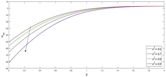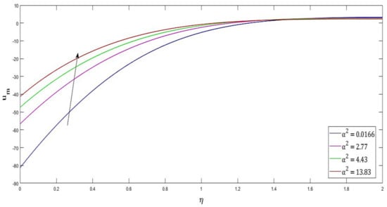 Figure 2 depicts the effect of the porosity parameter on the velocity profile in the general magnetorheological situation. Because the Darcy parameter is related to permeability, an increase in conductivity implies an increase in permeability. Consequently, the amount of matrix particles in the porous media diminishes. In biomedical scenarios, such threads can take the form of blocking material, tumors, or fatty deposits. A reduced presence of such elements will result in a drop in the Darcian drag force in Equation (2), lowering the resistance to flow and accelerating the biofluid, increasing velocity .