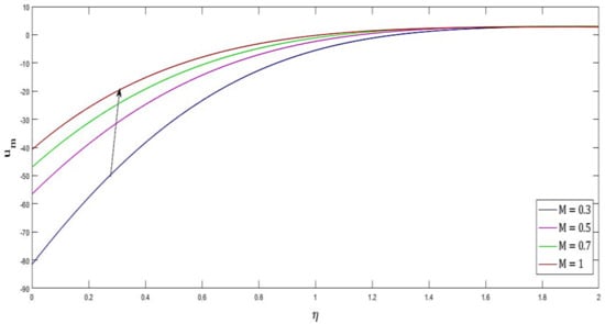 Figure 3 shows that speed goes up as the Hartmann number increases. It is then expected that an expansion in M improves the resistive power, called the Lorentz force, which goes against the level stream. The consequences of the hydrodynamic case and its related issues can be recuperated as a restricting instance of our investigation by taking M = 0.