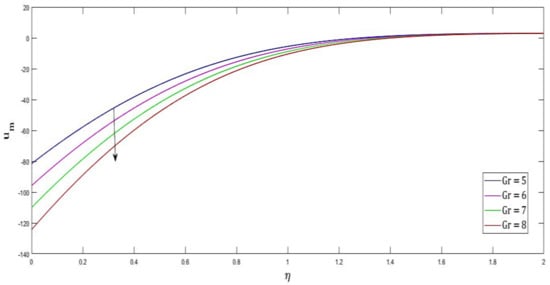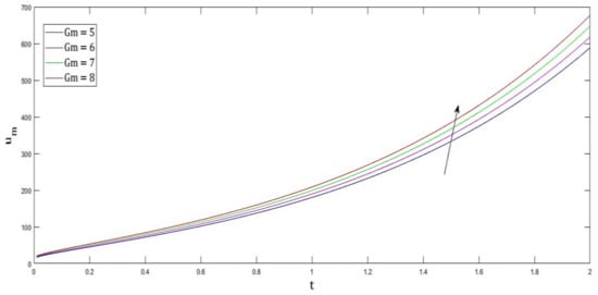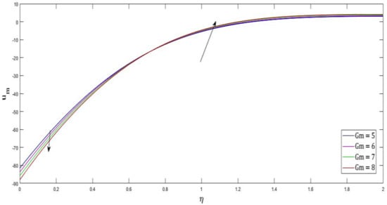 Figure 4 depicts the effect of the Grashof number Gr for the heat transfer on the velocity U of the flow field. In physical terms, the Grashof number for the thermal performance Gr denotes the strength of the thermal buoyancy force compared to the viscous hydrodynamic force in the boundary layer. The Grashof number Gr for the heat transfer accelerates the velocity U of the flow field at all sites, according to the curves. The reason for this is that the thermal buoyancy force has increased. Figure 5 shows the influence of the Grashof number Gm for the molecular diffusion on the flow field’s velocity U. Grashof number Gm for mass transfer represents the strength of a species’ buoyant force in proportion to viscous hydrodynamic force.
